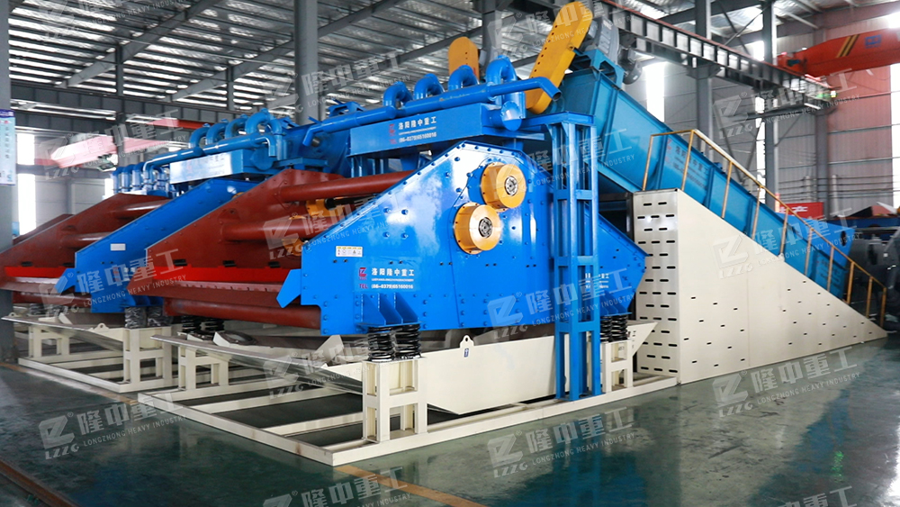 經(jīng)過(guò)破碎篩分后的物料進(jìn)入螺旋洗砂裝置,清洗之后合格物料將進(jìn)入后端尾礦干排裝置進(jìn)行脫水,由于固體物粒大小的不同,比重不同,所以液體中的沉降速度不同,細(xì)顆粒浮游在水中成溢流出,粗顆粒沉于槽底,由螺旋洗砂一體機(jī)的螺旋推向上部排出,同時(shí)利用水力和機(jī)械力使礦石碎散并擦洗礦石上的雜質(zhì)和泥土,洗下礦石表面細(xì)泥并分離。旋流器的沉沙嘴位于尾礦干排篩的上方,形成濃縮后的物料落入尾礦干排篩,而旋流器分離的水體流入到回收水箱內(nèi)部。其余廢水進(jìn)入反水裝置排出,完成整個(gè)流程。